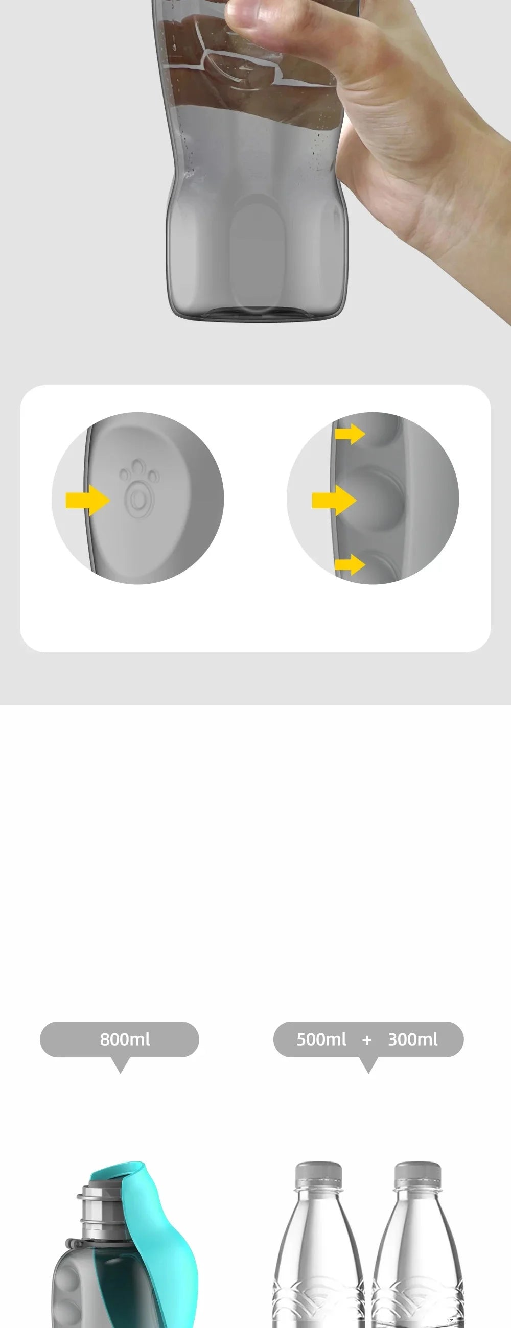 This large-capacity 800ml dog water bottle is designed for easy and convenient hydration on the go. Perfect for travel, walks, hikes, and outdoor activities, it suits small, medium, and large dogs as well as puppies and cats.